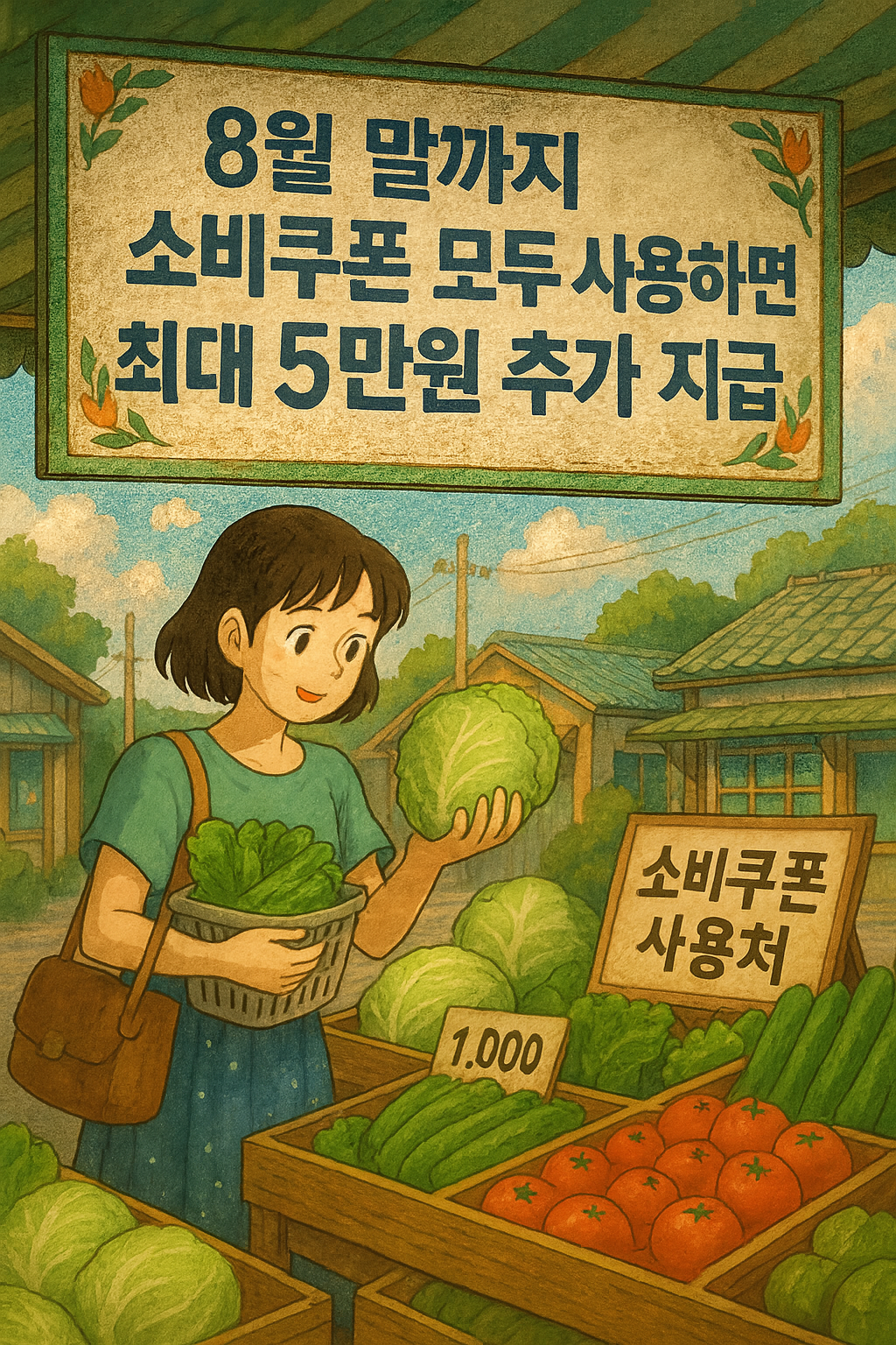 지급받은 소비쿠폰을 8월 안에 다 쓰기만 해도 최대 5만 원의 추가 혜택이 주어진다니, 이보다 좋은 알뜰 찬스는 없을 것입니다.