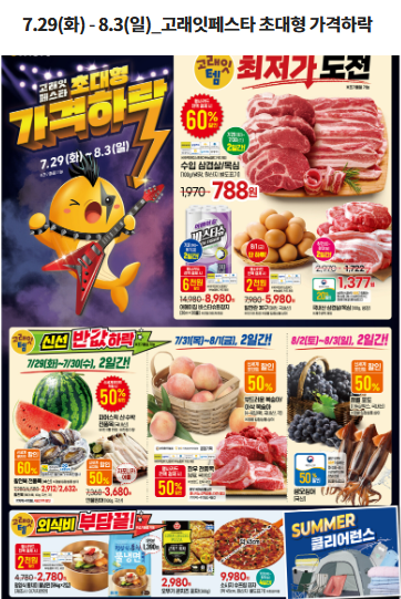- 삼겹살: 여름 캠핑, 홈파티 수요에 적합한 인기 품목으로, 수입산과 국내산을 일별로 나누어 대폭 할인 제공.