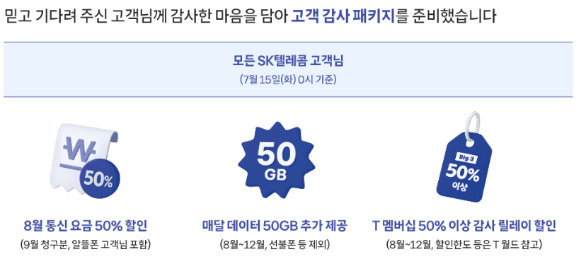 SK텔레콤은 지난 2025년 4월 발생한 보안 사고에 대한 공식 보상 조치로, 7월 15일 0시 기준 가입한 모든 고객에게 2025년 8월부터 12월까지 매월 50GB의 무료 데이터를 자동 제공한다고 밝혔습니다.